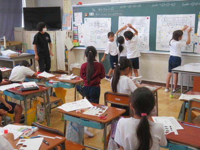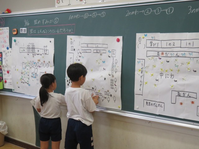 9/16 理科の授業 公開日 2025/09/16 更新日 2025/09/16 できごと 3年生は、理科「虫のすみかを見つけよう」で、中庭や校庭で、虫がどこに、どのようにいるか探しました。 班ごとに、発見したことを黒板にまとめていました。そこからどんなことが分かるか、次の授業がワクワクします。