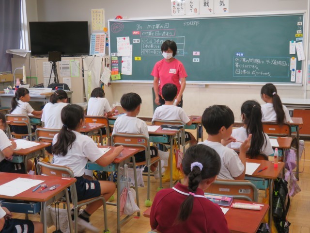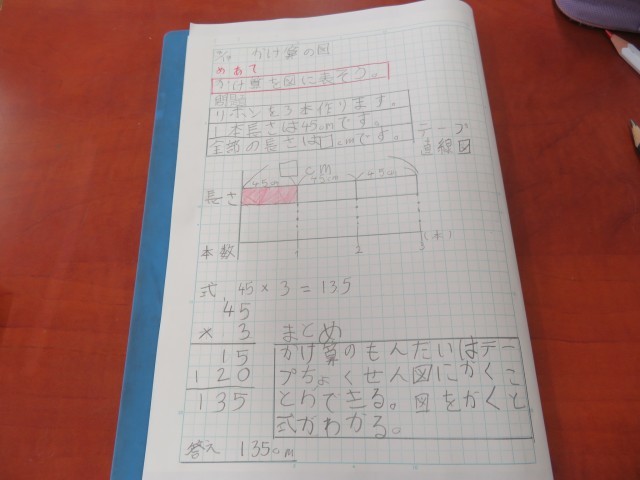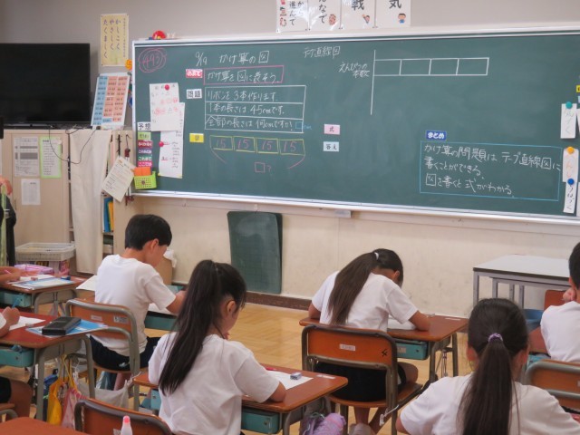 9/19 算数の授業 公開日 2025/09/22 更新日 2025/09/22 できごと 9月19日(金)、3年生は、算数「かけ算を図に表そう」で、「テープ直線図」の書き方にチャレンジしていました。 「テープ直線図」を書くことで、式が分かることを発見しました。