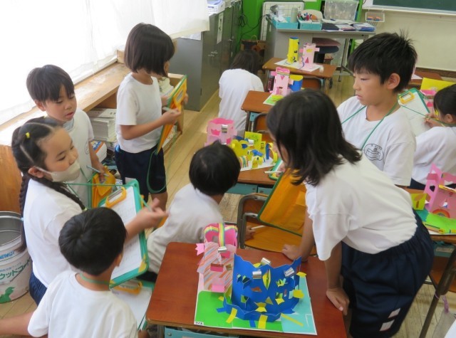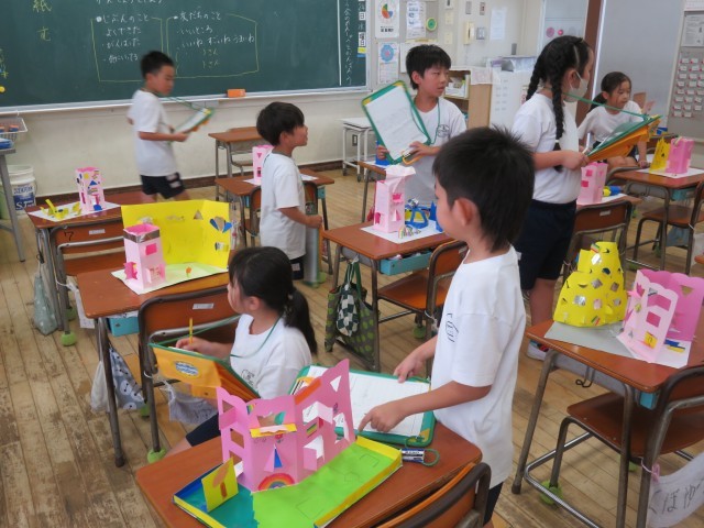 2年生は、図工「まどからこんにちは」で、完成した作品の鑑賞会をしていました。