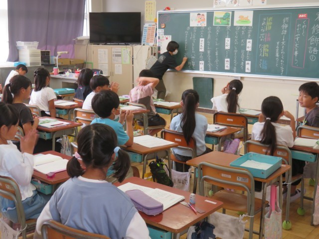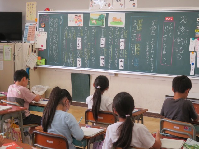 9/30 国語の授業 公開日 2025/10/01 更新日 2025/10/01 できごと 3年生は、国語で「修飾語」について知り、詳しく分かりやすい文を書いていました。 絵をヒントにしながら、楽しい文作りをとおして、「修飾語」について言葉を広げていました。