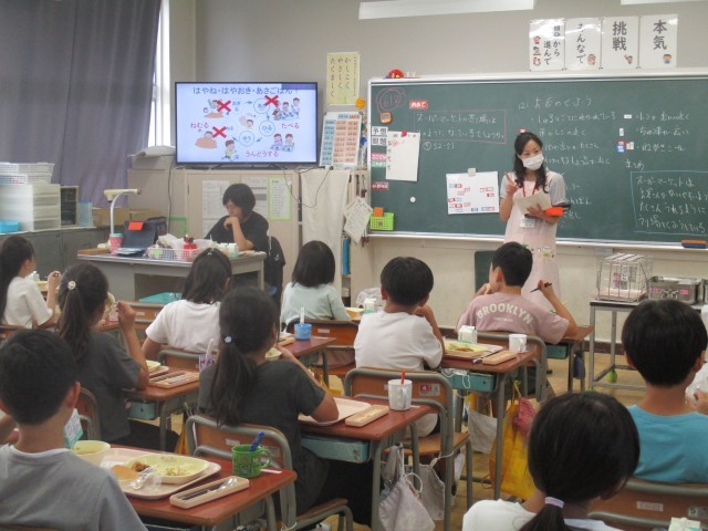 9/30 栄養士による給食訪問 公開日 2025/10/01 更新日 2025/10/01 できごと 9月30日(火)、学校給食センターの栄養士さんが、3年生に食育にかかわるお話をしてくださいました。 「はやね、はやおき、あさごはん」はなぜ大切なのか、スライドを見ながら考えました。