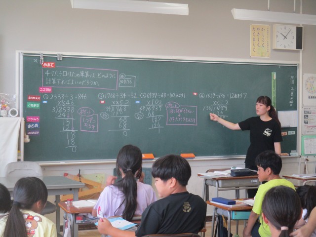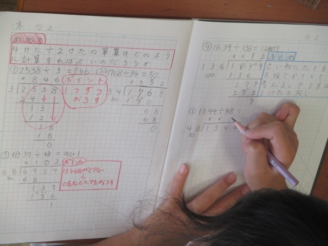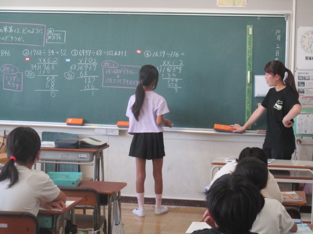 10/2 算数の授業(2) 公開日 2025/10/02 更新日 2025/10/02 できごと 4年生は、算数で「4けた ÷ 2けた」、「4けた ÷ 3けた」のひっ算のやり方を考えました。 「1639 ÷ 136 = 12 あまり7」などの筆算を、一つずつやり方を説明しながらチャレンジしました。