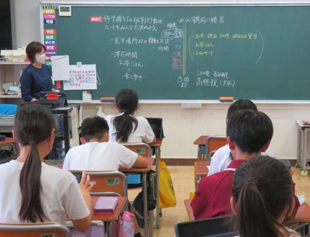 10/15 総合の授業(1) 公開日 2025/10/15 更新日 2025/10/15 できごと 10月15日(水)、6年生は、総合的な学習の時間に「修学旅行鎌倉班別行動」の計画を話し合っていました。 10月19日(日)~20日(月)に、修学旅行で鎌倉・東京方面に出かけます。仲間と協力し合って、かけがえのない思い出をつくってほしいと思います。
