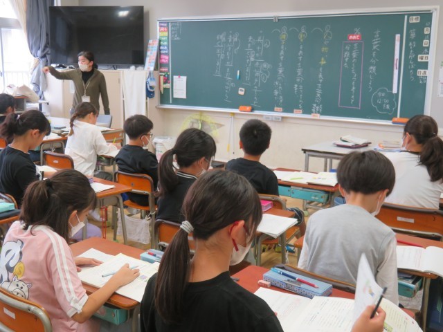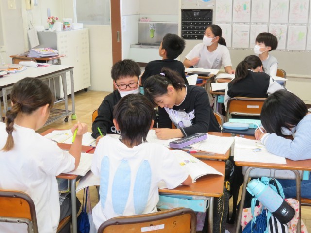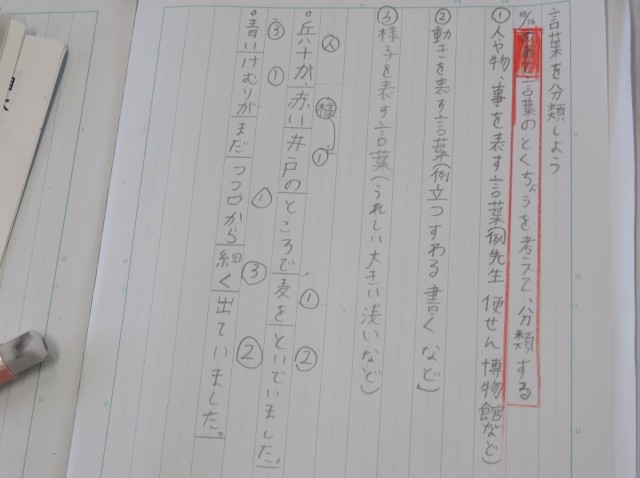 10/16 国語の授業(1) 公開日 2025/10/16 更新日 2025/10/16 できごと 10月16日(木)、4年生は、国語「言葉を分類しよう」に取り組んでいました。 これまで学習した教科書の文を「人、物、事」「動き」「様子」を表す言葉に分けました。