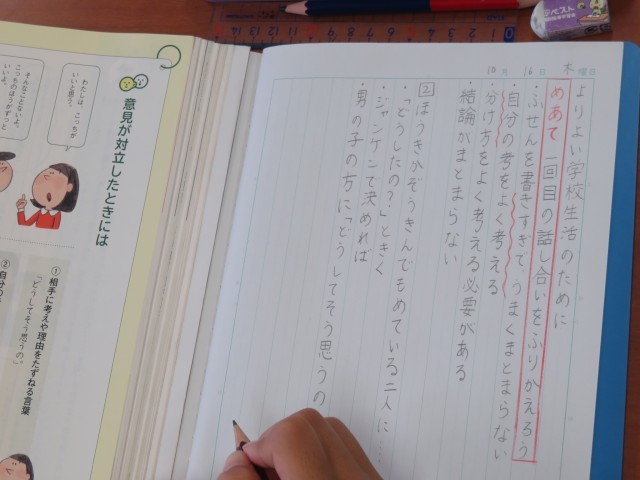 5年生は、国語「意見が対立したときには」で、「よりよい学校生活のために」話し合ったことを振り返りました。