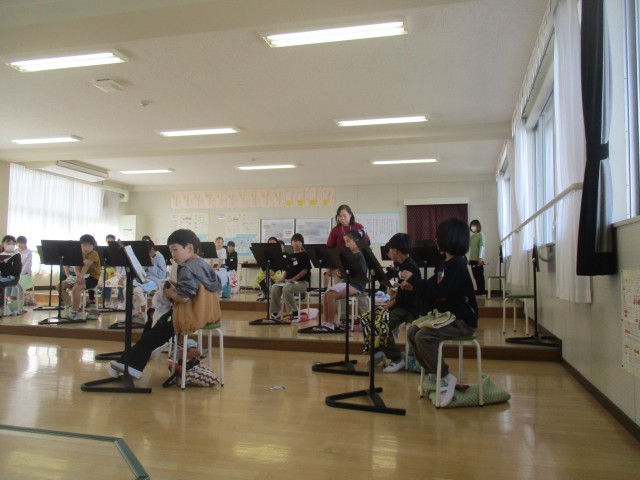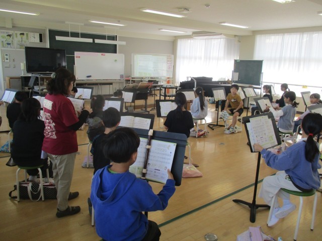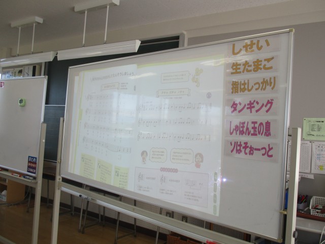 3年生は、リコーダーで「あの雲のように」を演奏していました。ホワイトボードに書かれた「しゃぼん玉の息」などのポイントを意識して、やさしくきれいな音色を響かせていました。