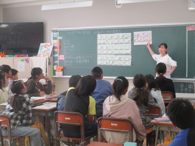 10/21 5年生社会 公開日 2025/10/21 更新日 2025/10/21 できごと 5年生では、身の回りの工業製品について活発に意見を出し合いながら、機械工業やせんい工業等、6つに仲間わけをしていました。後半は、他の班の発表を聞きながら、自分たちの班にはなかった製品に気づき、これからの学習に意欲を高めていました。