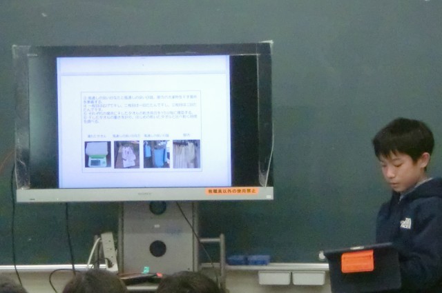 美土里小からは、6年生が「洗濯物が乾く時間と条件について」の研究テーマで発表しました。
