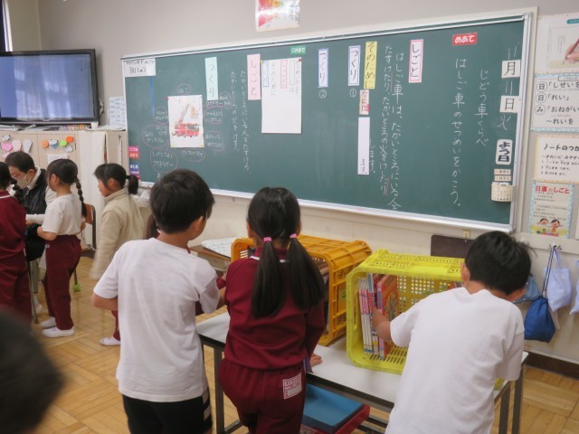 1年生の国語「じどう車くらべ」では、関連するたくさんの本を見比べながら考えを広げる学習もしています。