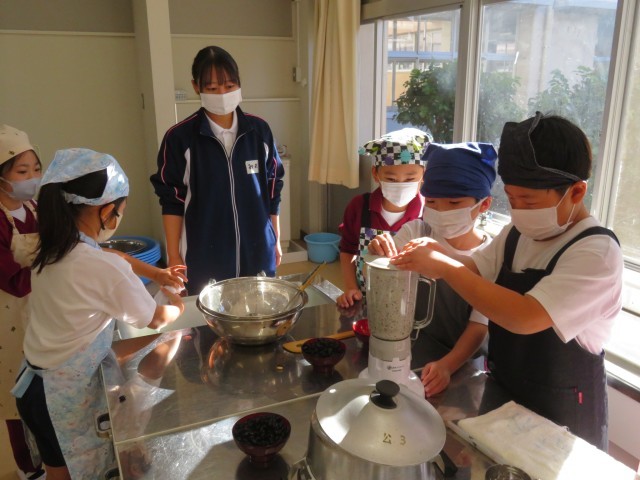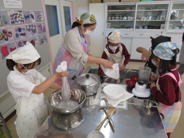 11/12 とうふ作り(2) 公開日 2025/11/12 更新日 2025/11/12 できごと 3年2組の豆腐作りの様子です。普通の大豆と、黒大豆の2種類を使って、豆腐を作りました。 ミキサーでつぶした後、布でしぼっていました。調理室から美味しそうな豆腐の香りがしていました。