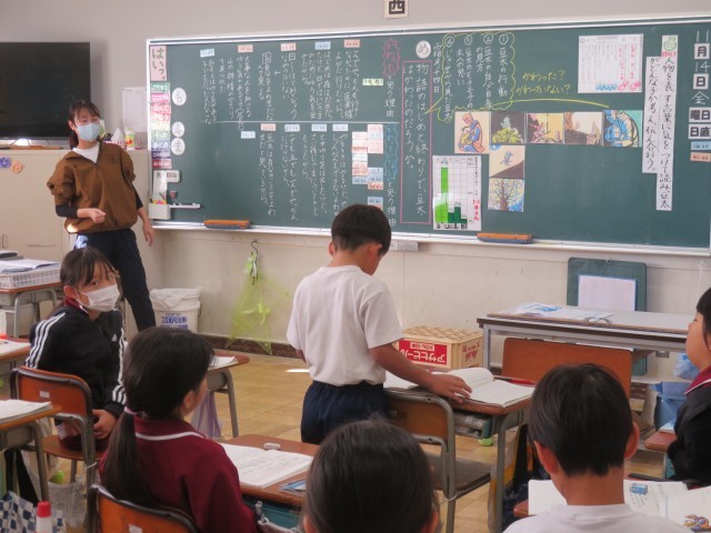 11/14 国語の授業(2) 公開日 2025/11/14 更新日 2025/11/14 できごと 3年生は、国語「モチモチの木」で、主人公のまめ太が「物語の初めと終わりで変わったか」を話し合いました。 自分の考えをしっかり伝えるだけでなく、友だちの意見をしっかり聞いて、考えを深めました。