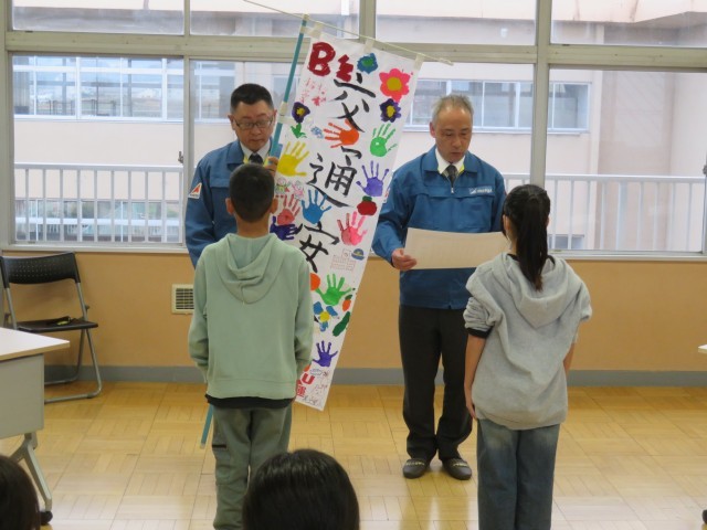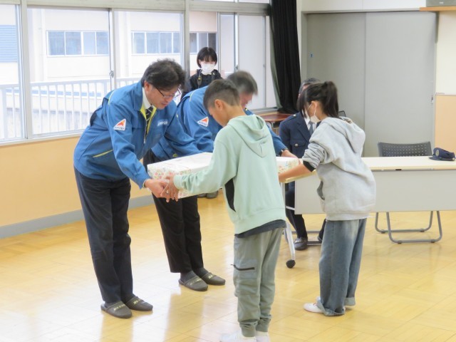 愛知陸運(株)の牛島社長から、各校の代表児童生徒に感謝状と記念品が手渡されました。