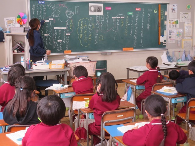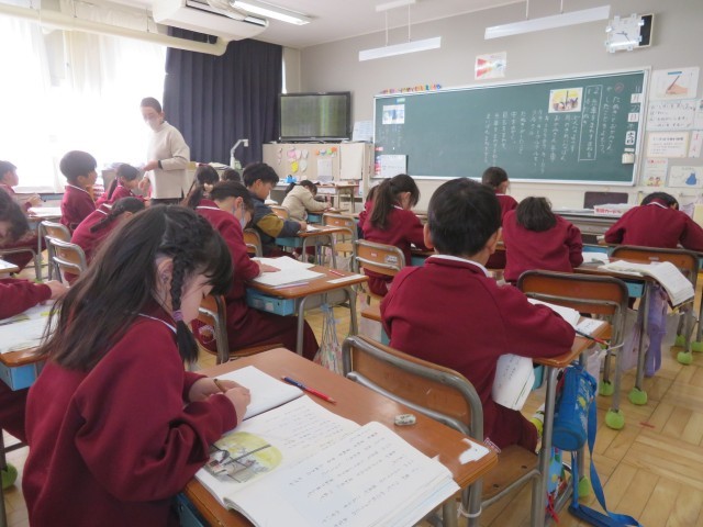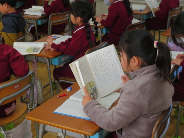 11月27日(木)、1年生は、国語「たぬきの糸車」で、好きなところを見つけながら読んでいました。