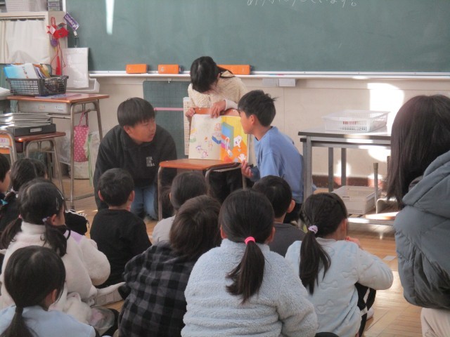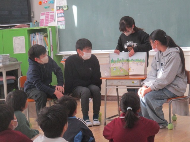 12/12 読み聞かせ(1) 公開日 2025/12/12 更新日 2025/12/12 できごと 12月12日(金)の業前活動は、1,2年生は、図書委員と西ドリームネットボランティアの方による「読み聞かせ」でした。 図書委員は、この日のために、委員会活動の時間や、休み時間を使って、一生懸命練習しました。