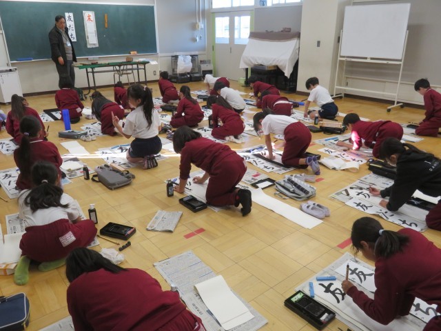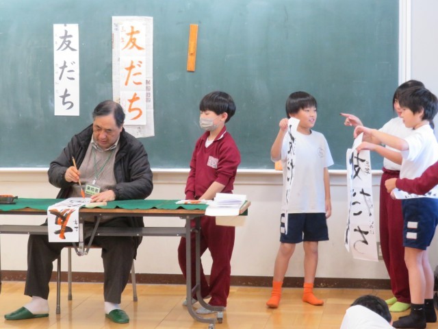 12/16 書き初め教室(3) 公開日 2025/12/16 更新日 2025/12/16 できごと 初めて書いた作品「友だち」を髙橋維周先生に見ていただきました。 たくさん褒めてもらい、どの子も嬉しそうでした。