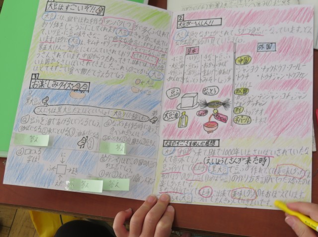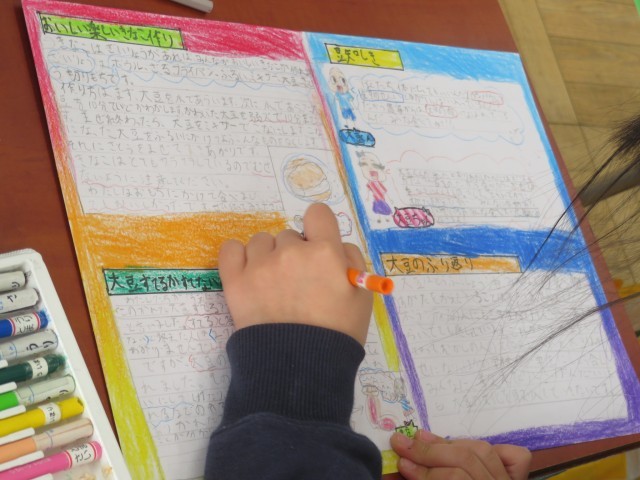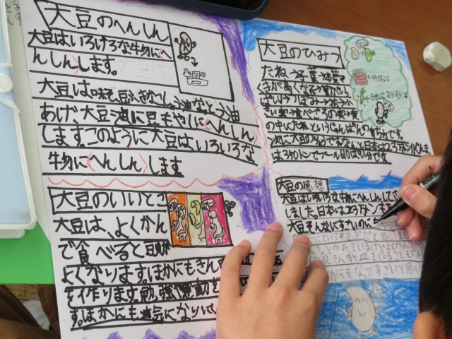 12/18 総合的な学習の時間(2) 公開日 2025/12/18 更新日 2025/12/18 できごと 子どもたちは、「大豆のすごさ」を自分なりの言葉でリーフレットにまとめ、発信していく探究的な学習に夢中でした。