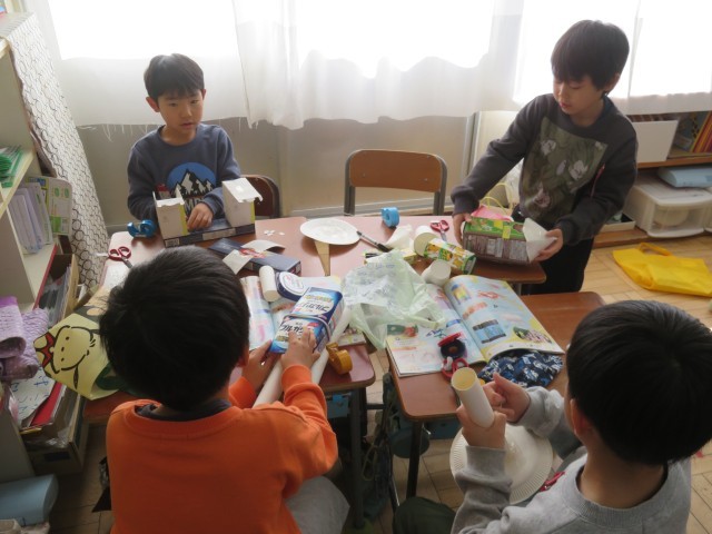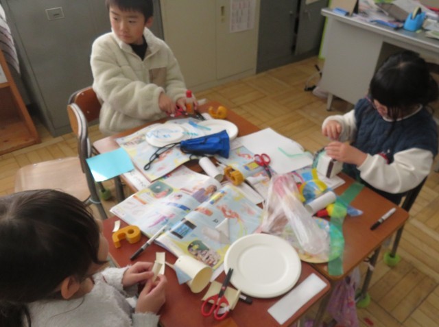 1/21 図工の授業(1) 公開日 2026/01/22 更新日 2026/01/22 できごと 1月21日(水)、1年生は図工「スルスル ビューン」で、張ったロープをすべるおもちゃを作りました。 グループで話し合いながら、形や飾りを工夫していました。