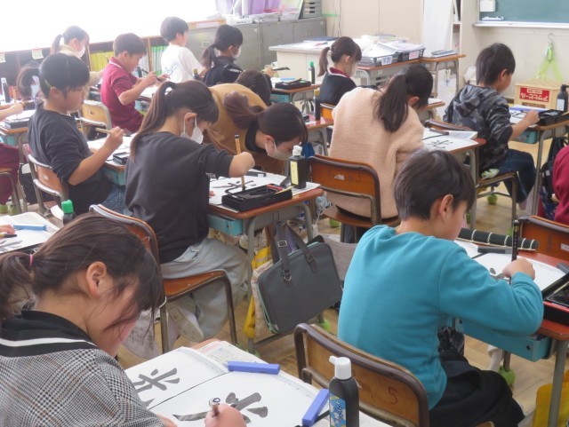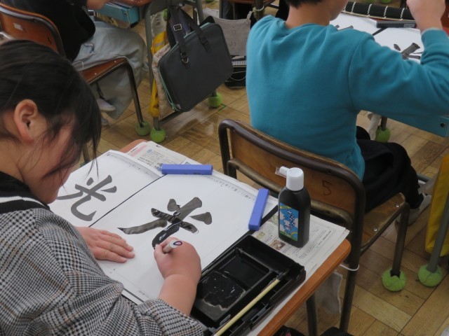 1/28 書写の授業 公開日 2026/01/28 更新日 2026/01/28 できごと 1月28日(水)、3年生は書写「光」に取り組んでいました。 「まがり」と「はね」に注意して、丁寧に書いていました。
