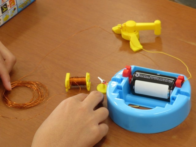 5年生は、理科「電流のはたらき」で、電磁石に方位磁針を近づけるとどうなるかを実験しました。