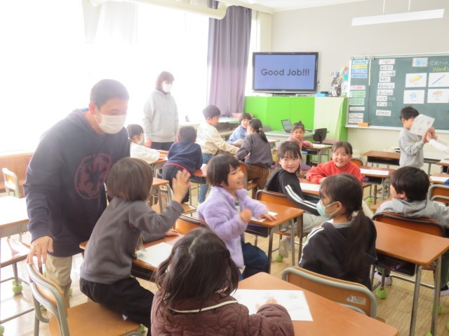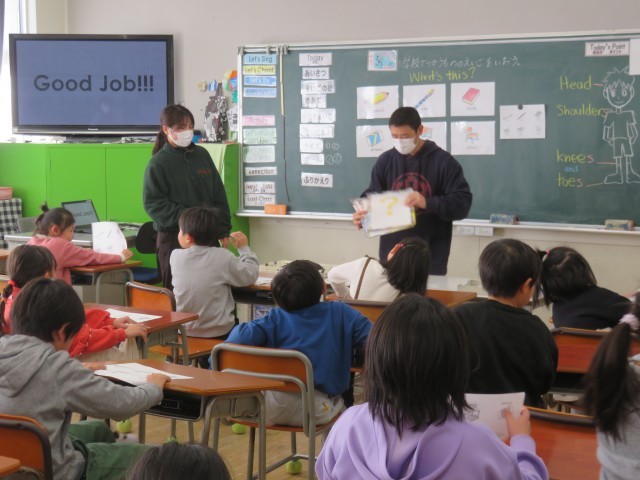 2/9 外国語活動の授業(1) 公開日 2026/02/09 更新日 2026/02/09 できごと 2月9日(月)、1年生は外国語活動で「学校で使うもの」の名前を英語で覚えました。 クイズをとおして、「pen」「book」など、楽しく覚えました。