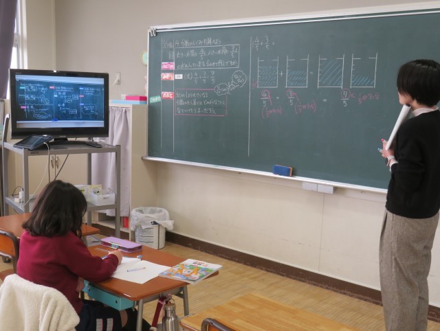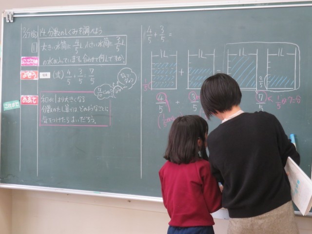 分数のたしざんで和が1より大きくなるときのイメージを図を使って考えました。