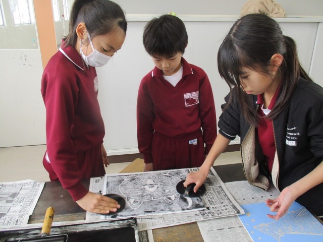 2/27 図工の授業 公開日 2026/02/27 更新日 2026/02/27 できごと 2月27日(金)、4年生は図工「版画」の刷りにチャレンジしていました。 彫刻刀で丁寧に彫った版木にローラーでインクをつけ、ばれんでよくこすりました。仕上がった版画を見てみんな嬉しそうでした。