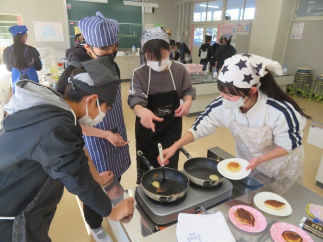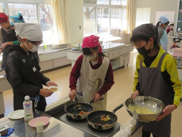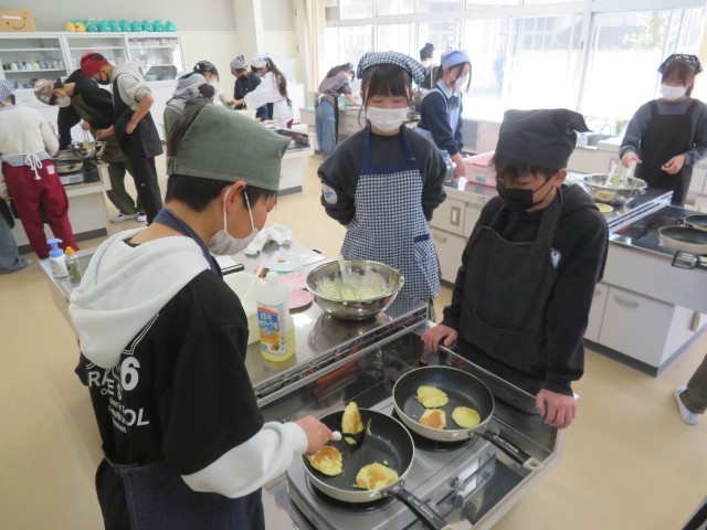 3/12 調理実習(1) 公開日 2026/03/12 更新日 2026/03/12 できごと 3月12日(木)、6年生は、最後の調理実習に取り組みました。 卒業前に、先生方への感謝の気持ちを込めて「パンケーキ」を作りました。