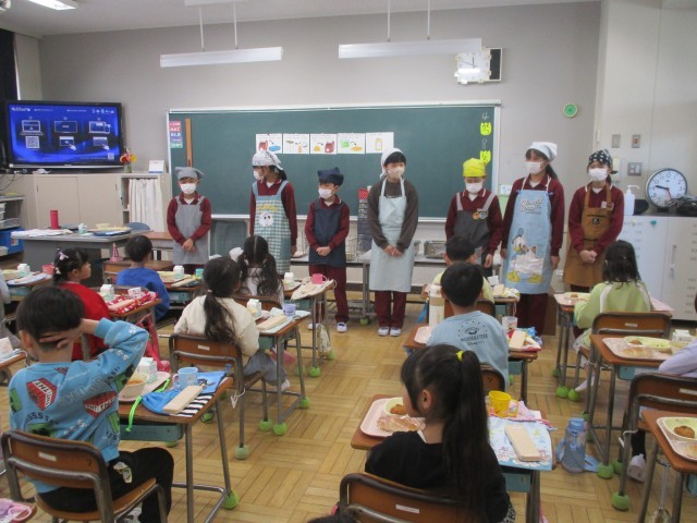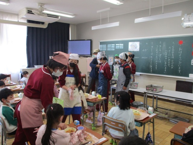 6年生は、1年生の給食の準備のお手伝いに来てくれました。1年生は初めての給食です。お兄さんお姉さんの手際のよさを、よい姿勢で見ながら静かに待っていました。6年生は「食べきれるかな?」「ストローある?」と、優しく声をかけていました。1年生も「ありがとうございました。」「また来てね。」と、お礼を伝えると、6年生も優しく手を振ってくれました。