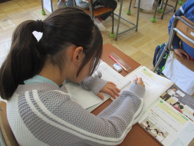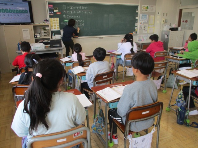 3年生は、かけ算の求め方を説明する学習をしていました。「これまで」2年生の時に、かけ算のきまりを学びました。「4の段のかけ算は得意!」という自信満々の声が上がりました。4の段は「かける数が1増えると、答えは4増える」ことを確認すると、「7の段も簡単だ!」と、進んで取り組む姿がありました。今までの学習を生かして、新しい知識を深めていって欲しいと思います。