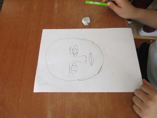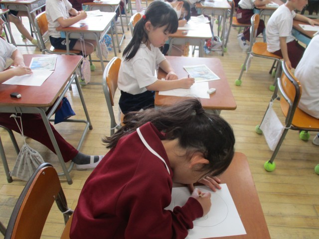 2年生は、自分の写真を見て自分の顔を描く練習をしていました。「難しいな。」と言いながらも、「まゆげをかこう。」「まつ毛もあるな。」と、自分の顔をよく見て、描いていました。どんどん自分に似ている表情になってきました。