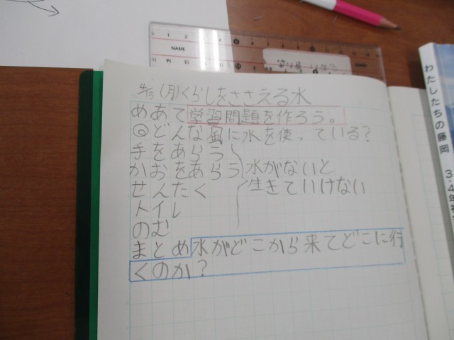4年生は、いつも身近にある水がどのようにきれいになって、蛇口から出てくるのかを考える学習をしていました。今日のめあては、「学習問題をつくる」です。子どもたちの言葉で「水がどこから来て、どこに行くのか」に、まとめることができました。これからの学習で課題を解決していくのが楽しみです。