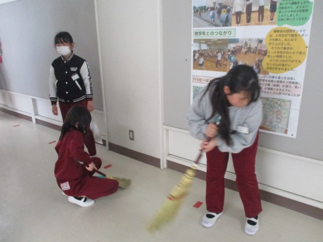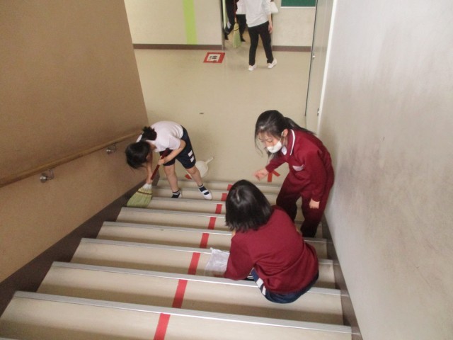 給食の後は、掃除の時間です。広い廊下や階段、みんなが使うトイレも丁寧に掃除をしていました。床だけでなく心もきれいになったようで気持ちがよいです。