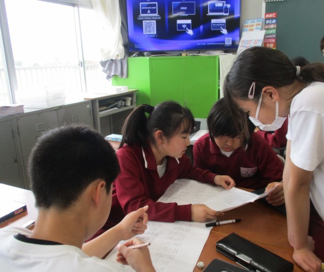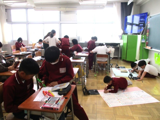 6年生は、学級目標を考えていました。学級目標を考えた後は、それぞれの係ごとに活動していました。自分たちで考えた係の活動内容を工夫しながら、係ごとに自分たちで取り組んでいる姿が印象的でした。教科のプレートを作った係の子は、教科の特徴がわかる絵や色など工夫して楽しいものに仕上がりました。