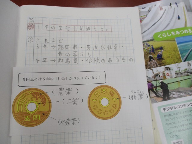 5年生は、1年間の学習を見通していました。「これまで」3年生では、藤岡市の身近な仕事や昔の暮らしについて、4年生では、群馬県の伝統あるものなどについて学習してきました。さて、5年生では「5円玉」には5年生の社会がつまっていることに驚きを感じ、これからの学習を楽しみになりました。