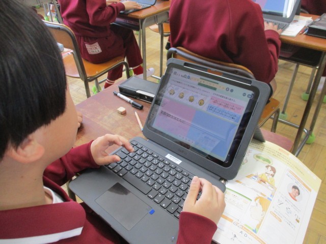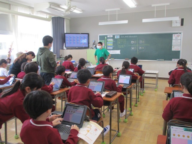 5年生は、英語の授業の進め方を知る学習をしていました。“Say,Hello!”の歌を歌ったり、ローマ字を書いたりしました。授業の振り返りはロイロノートにまとめていました。次回は英語で自己紹介をするので、楽しみな様子でした。