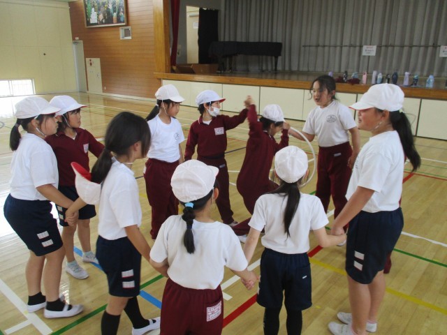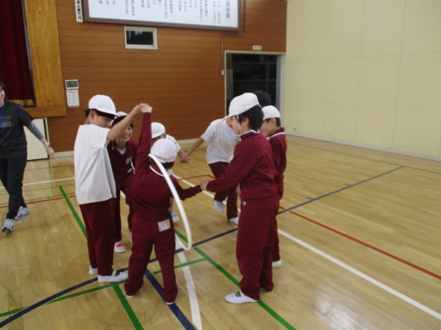 3年生は、友達とつないだ手をはなさないでフラフープを通り抜けることに挑戦していました。お互い気持ちを合わせて、声をかけ合いながら取り組んでいました。最後の友達まで成功すると、「できた!」と、笑顔が広がりました。