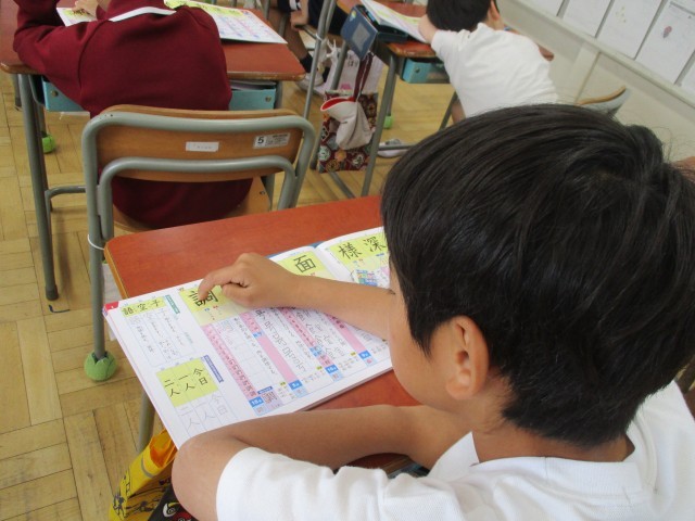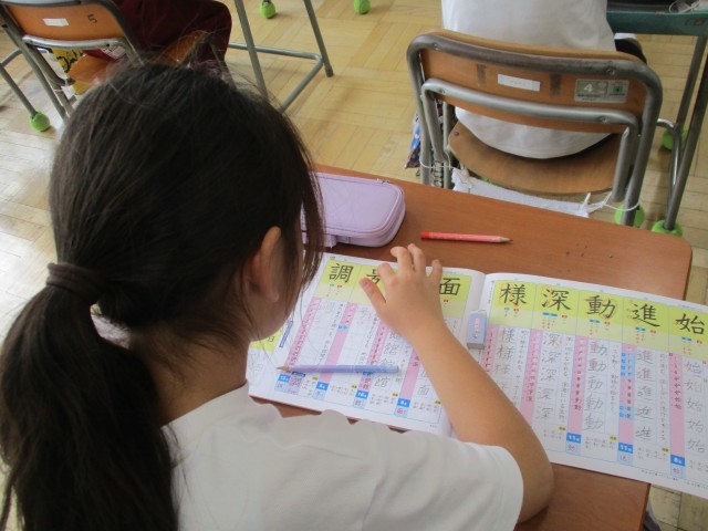 3年生は、新しい漢字を学習していました。3年生になると、難しい漢字が増えますが、書き順や読み方もしっかり確認しながら書いていました。丁寧に書いている友達のことを「上手だね!と、賞賛していました。丁寧に書いている子も、友達のよさに気付くことができる子も素敵です。
