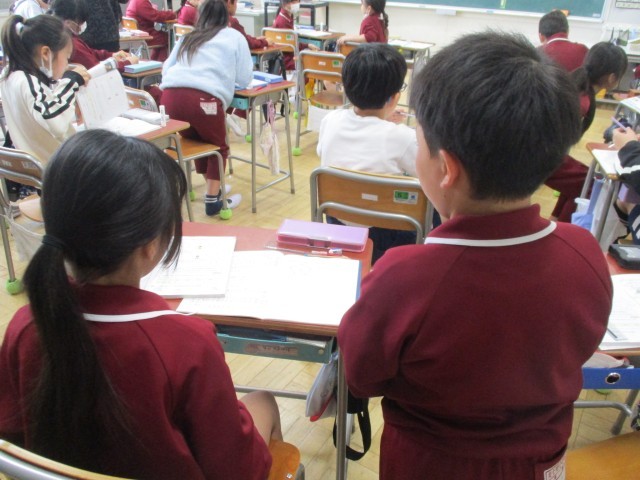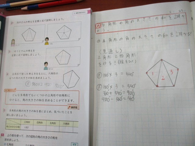 5年生は、多角形の角の大きさを調べる学習をしていました。「これまで」の学習で、三角形の3つの和が180度であること、四角形の4つの角の和が360度であることを学びました。そのことを活用すると、「かんたん!」と言いながら問題を解いていました。問題を解き終わるとそばの友達と考えを伝え合っていました。多様な考え方があることに気付きました。
