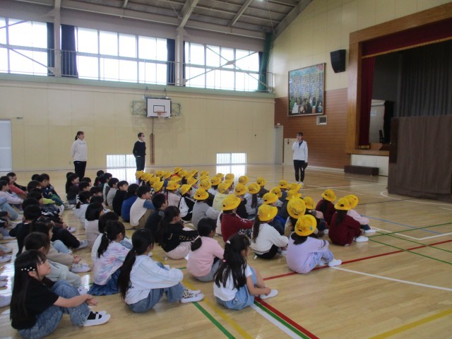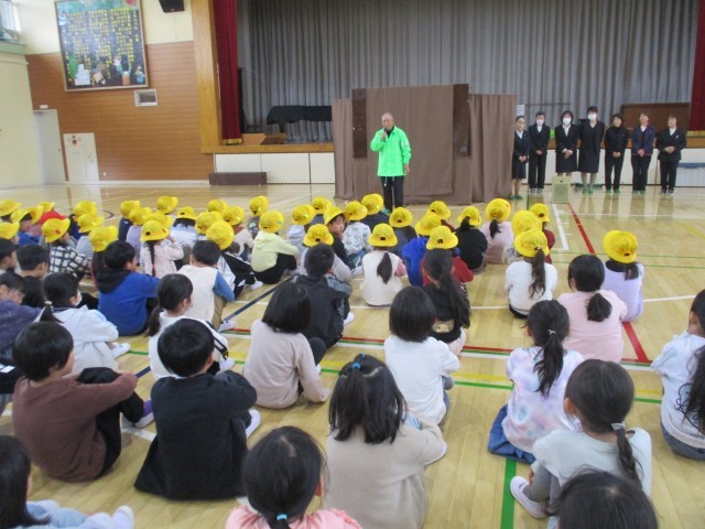 1、2年生は、藤岡市警察署の方や藤岡市交通安全協会の方々をお招きして、交通安全教室を行いました。よい姿勢でお話を聞いた後は、婦人部の皆さんによる大きな紙芝居です。子どもたちは、体を前のめりにしながら聞いていました。「とびだしは ぜったいしない」ことをみんなで約束しました。