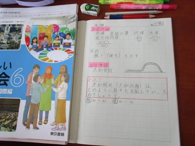 6年生は、「大和朝廷(大和政権)はどのように国土を支配していったのか」とめあてに学習をしていました。教科書や資料集を読んだ後、「大和朝廷とは?」の問いをどんどんまとめていました。