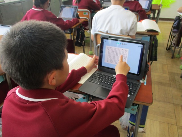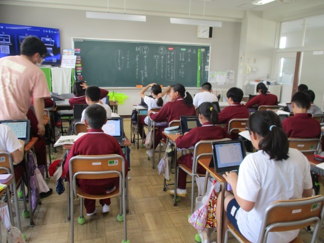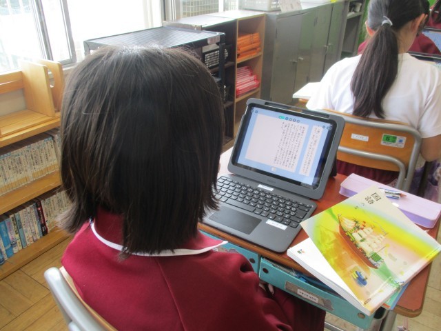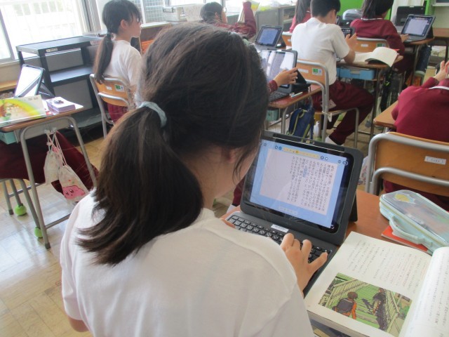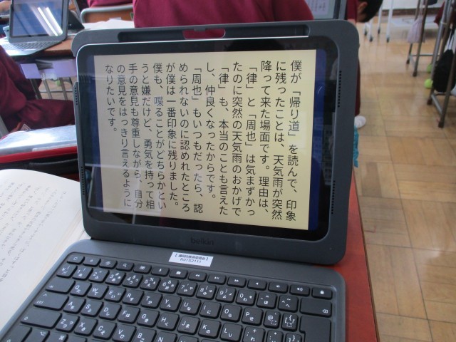 6年生は、「帰り道」の学習で、印象に残ったのかを文章にまとめて共有する学習をしていました。しっかり考えて文章にまとめており、感心しました。まとめ終わると、ロイロノートに提出をし、友達の意見を読んで自分の考えと比較して学びを深めていました。