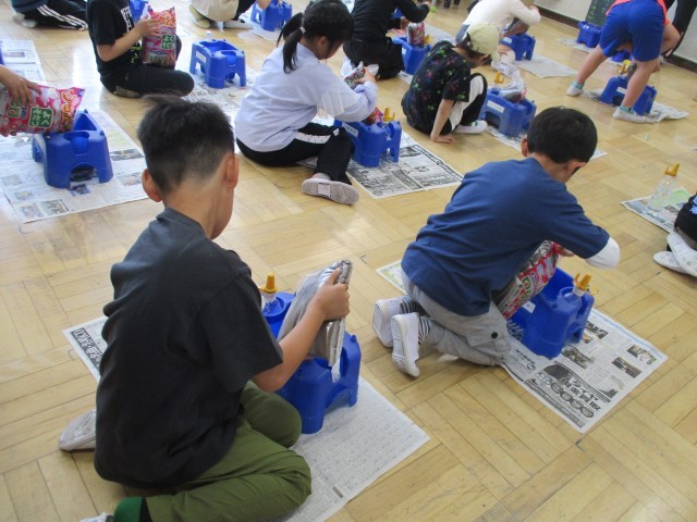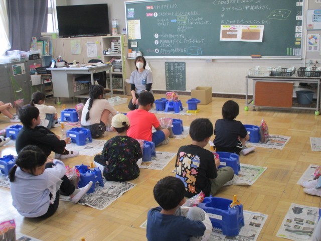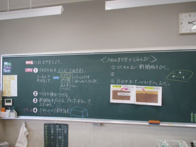 3年生は、種まきをしていました。自分の植木鉢にホウセンカ、牛乳パックにひまわりとオクラの種を植えました。こぼさないように慎重に土を入れたり、種に優しく土をかぶせたりしていました。早く準備が終わった子が、友達を手伝っていてとても温かい気持ちになりました。これからも優しい気持ちで育ててくれると感じました。