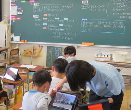 4/17 授業の様子(2) 公開日 2024/04/18 更新日 2024/04/18 できごと 4年生の総合的な学習の時間では、これまで学習してきたこと、これから学習していきたいことについて、興味をもって話し合っていました。 また、理科では、これまでにタブレットで撮影した「春」について、気づいたことを話し合っていました。