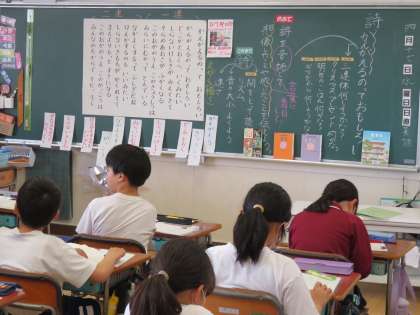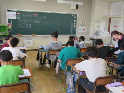 5年生の国語では詩「かんがえるのっておもしろい」を読んで感じたことを話し合っていました。また、リズムや抑揚、早さなどに気をつけて感じたことを伝えられるように工夫して読んでいました。