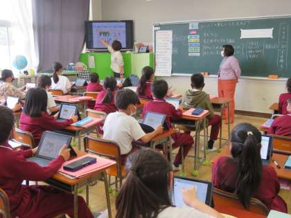 英語では、ALTのマリア先生とデジタル教科書を使って「自己紹介のしかた」を考えていました。