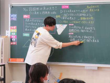 4/22 授業の様子 公開日 2024/04/23 更新日 2024/04/23 できごと 5年生は、英語「自己紹介から聞き取ろう」の学習にチャレンジしていました。 英語での自己紹介を聞き取ろうと思って聞き直すことで、いろいろなことに気づくようになりました。 算数では、三角形と四角形の角について、これまで学習したことを使って調べていました。