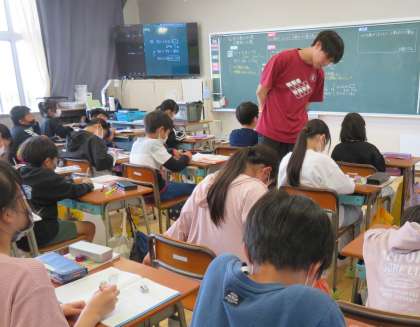 5/10 授業の様子 公開日 2024/05/10 更新日 2024/05/10 できごと 6年生は、英語「自分の宝物を紹介をしよう」の学習で、「My treasure is 〜 」の英語表現をリズムよく取り組んでいました。 また、算数「分数÷整数の計算の仕方」をこれまでの学習を使って考えていました。 5年生は、算数「小数のかけ算」で、「小数を整数に直すといいのではないか」いう見通しをもって、考えていました。