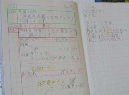 今日は、沖縄県の家づくりや農業について資料をもとに話し合っていました。