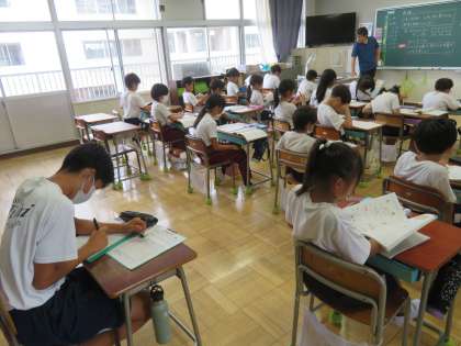 9/3 チャレンジウィーク(1) 公開日 2024/09/03 更新日 2024/09/03 できごと 9月3日(火)から6日(金)まで、中学生が仕事を体験するチャレンジウィークが行われています。 美土里小学校では、西中学校の2年生4名が働く体験をしています。「教師」の仕事のやりがいと苦労を少しでも発見して、将来の生き方につなげていってほしいと思います。 チャレンジウィーク初日の様子です。