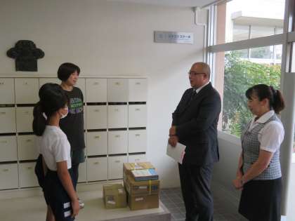 美土里小を代表して図書委員の2名が受け取らせていただき、お礼のお手紙を手渡しました。